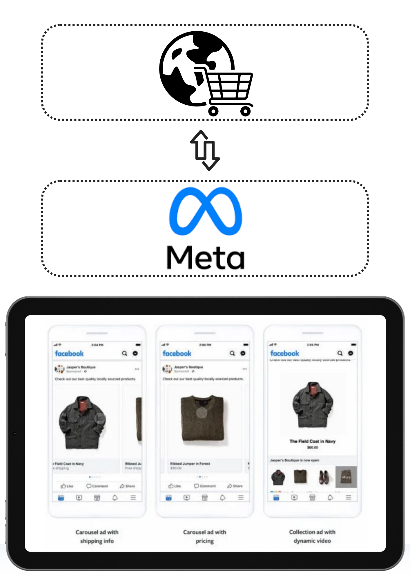 באמצעות קטלוג המוצרים, תוכל להציג את המוצרים שלך בצורה מקצועית בעמוד הפייסבוק של החנות, ב-Instagram Shopping, ובפרסום ממומן בפייסבוק.